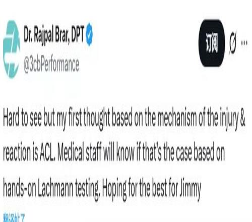 更令人揪心的是随后来自运动医学专家的初步判断。知名医学专家德文·布拉尔(Brar)在分析后写道:“从受伤动作和他的反应来判断,我第一反应是前交叉韧带(ACL)损伤。”