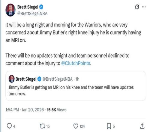名记Brett Siegel赛后曝出,勇士非常担心巴特勒的状况,后者正在接受核磁共振检查,今天不会更新任何伤情状况,勇士队内也拒绝对伤情发表任何评论。