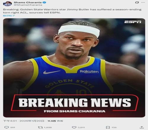 北京时间1月20日下午4点,据NBA名记Shams报道,勇士球星吉米-巴特勒检查结果公布:他遭遇右膝十字韧带撕裂,本赛季正式报销!今天勇士和热火比赛第三节,巴特勒右膝受伤,被队友架着回到更衣室,提前退出本场比赛。